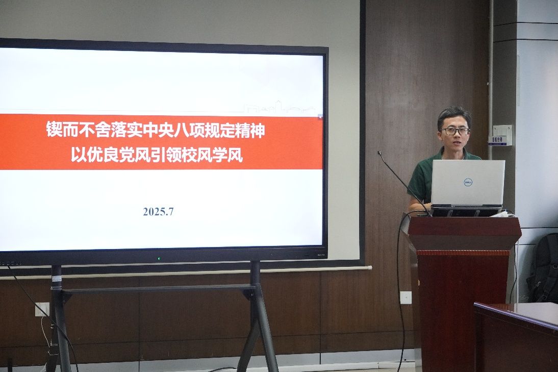 汪毓明圍繞中央八項規定出臺的背景、重大意義、主要內容和貫徹執行的實際成效進行了深入解讀。他強調,中央八項規定不僅是改進作風建設的“鐵規矩”,更是推動全面從嚴治黨的重要制度安排,體現了黨中央抓作風的堅定決心和鮮明態度。各位黨員同志必須進一步提高政治站位,把學習貫徹中央八項規定精神作為加強黨性修養、錘煉政治品格的重要抓手,做到內化于心、外化于行、常抓不懈。