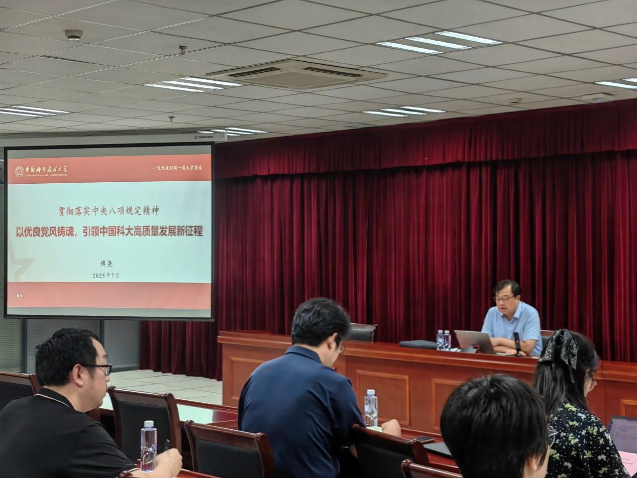7月9日下午,校黨委常委、副校長傅堯在圖書館四樓會議室以《以優良黨風鑄魂,引領中國科大高質量發展新征程》為題講授專題黨課??蒲胁颗c發展規劃處聯合黨支部、環境科學與工程系研究生第一黨支部的黨員及入黨積極分子參加了黨課學習。報告會由科研部與發展規劃處聯合黨支部副書記孫方穩主持。