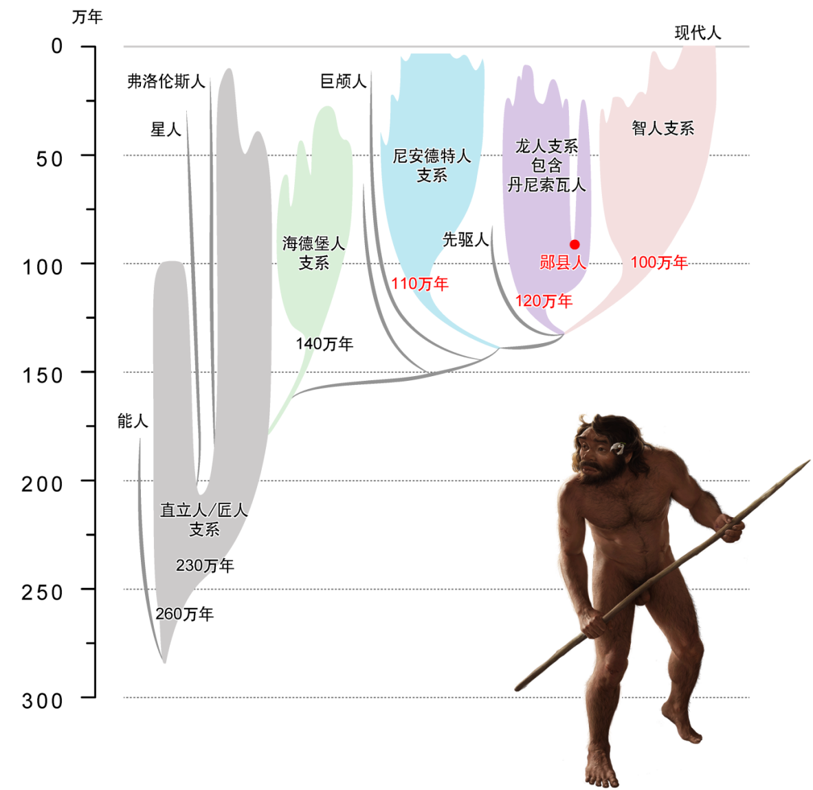 鄖縣人并非直立人,而是與丹尼索瓦人密切相關的龍人支系的早期代表。這說明早在100萬年前,人類祖先已經分化成多個獨立演化的群體,其分化時間之早、程度之復雜,遠超我們過去的想象。根據這一新的譜系框架,亞洲地區多數中更新世人類化石——包括大荔、金牛山、華龍洞、許家窯、夏河、澎湖及丹尼索瓦洞穴出土標本,以及發現于松花江哈爾濱江段的龍人正型頭骨——都可歸入龍人支系。該支系與智人擁有最近的共同祖先。
