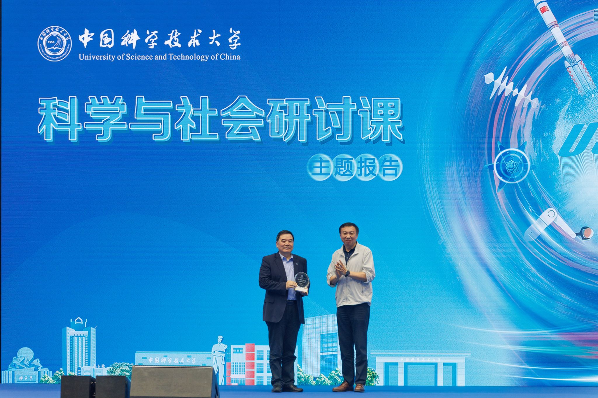 最后,舒歌群代表學(xué)校向包信和頒發(fā)了“科學(xué)與社會(huì)”研討課主題報(bào)告紀(jì)念牌。