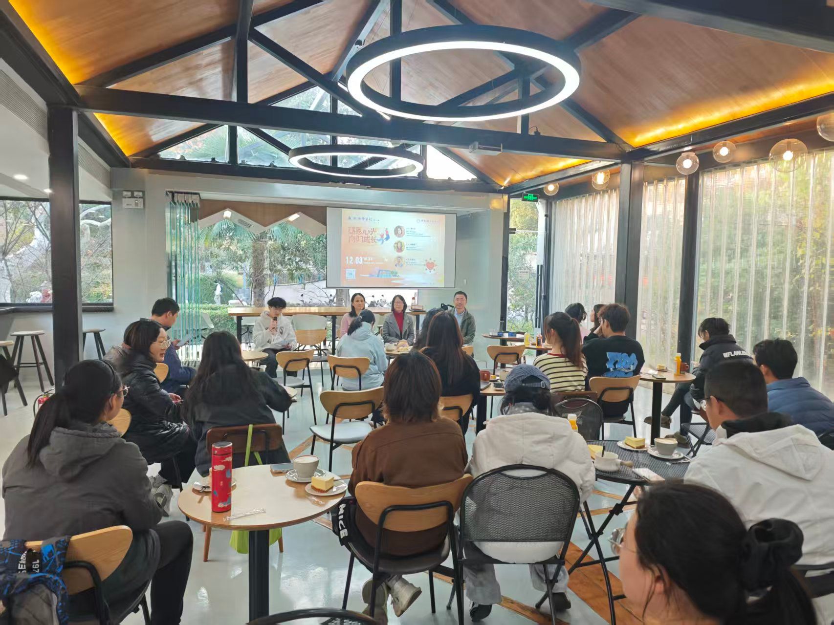 12月5日,第十七期“瀚海師生行”活動在中國科學技術大學東區1958咖啡廳舉辦。本期活動以“感恩心光,向陽成長”為主題,作為學校心理健康主題活動月系列活動之一,特邀夏紅衛、宮曉梅、李春生三位在心理健康領域擁有豐富經驗的嘉賓,與同學們展開了一場貼近心靈、啟迪成長的對話?;顒佑缮倌臧鄬W院2023級2班心理委員、微笑心理協會副社長楊碩同學主持,吸引了來自各院系的師生積極參與。