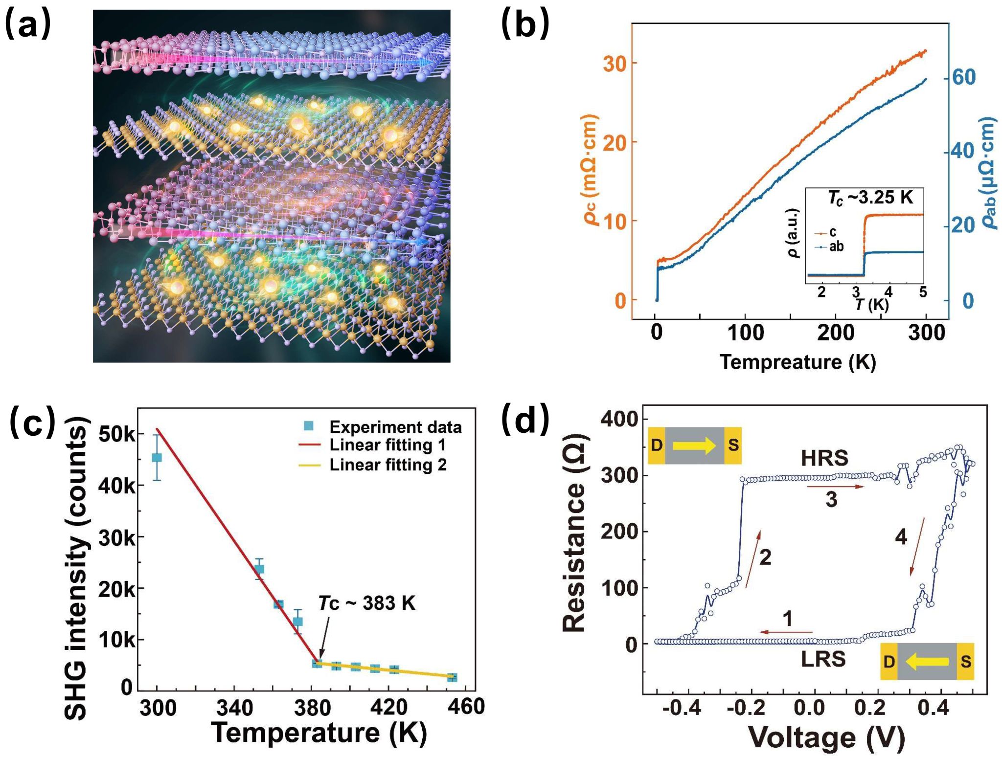 圖:(a)范德華超晶格(SnSe)1.16(NbSe2)示意圖,展示了鐵電層和金屬層的交替堆疊結構;(b)該晶體面內(nèi)方向和面外方向的變溫電輸運,展示了良好的金屬性和超導電性;(c)溫度依賴的非線性光學二次諧波效應和鐵電居里溫度;(d)鐵電憶阻效應,高低電阻態(tài)被小電壓脈沖所切換。