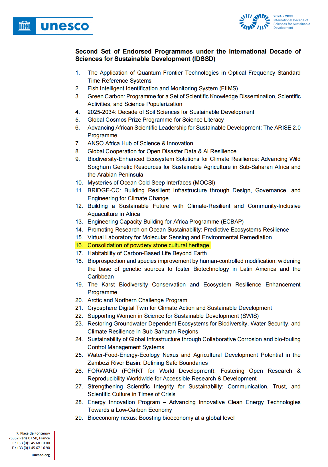 11月26日,中國科學技術大學牽頭發起的“粉化石質文物加固保護(Consolidation ofpowderystoneculturalheritage)”正式入選聯合國教科文組織(UNESCO)“可持續發展國際科學十年(IDSSD)”第二批全球行動計劃清單,成為本批次全球僅有的29項戰略行動計劃之一。聯合國教科文組織自然科學助理總干事莉迪亞?布里托(Lidia Brito)在致函中對該計劃的入選表示祝賀。