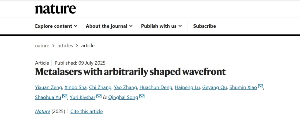 7月9日,哈爾濱工業大學(深圳)宋清海教授、肖淑敏教授、澳大利亞國立大學Yuri Kivshar教授以及鵬程實驗室余少華院士在國際頂刊《自然》(Nature)上發表了題為Metalasers with arbitrarily shaped wavefront 的研究論文。