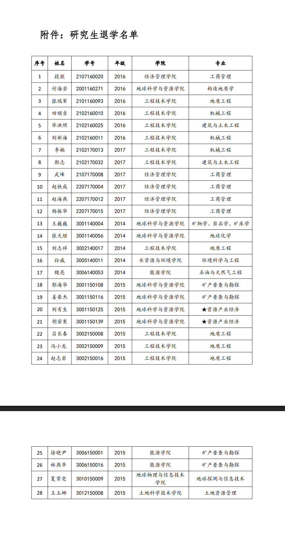 根據教育部《普通高等學校學生管理規定》(中華人民共和國教育部令第41號)第三十條第一款和《中國地質大學(北京)研究生學籍管理實施細則》第三十七條第五款等有關規定,經2025年7月2日校長辦公會議審議,學校決定對28名在學校規定的最長學習年限內未完成學業的研究生作退學處理(名單見附件)。由于長期難于聯系到學生本人,現以公告形式送達退學處理決定。