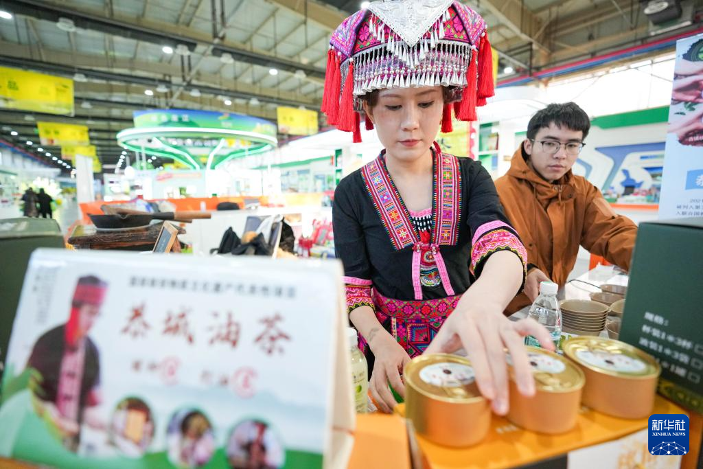 12月16日,在廣西恭城瑤族自治縣展位,工作人員在展示恭城油茶產品。
