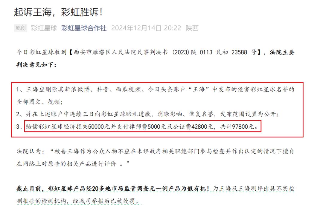 近日, 網(wǎng)紅 品牌 “彩虹星球”發(fā)布文章稱收到西安市雁塔區(qū)人民法院的一審民事判決書。