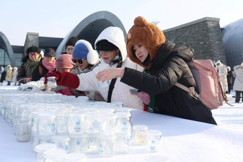 游客在哈爾濱冰雪大世界領取“首日冰”。新華社發(殷忠偉攝)