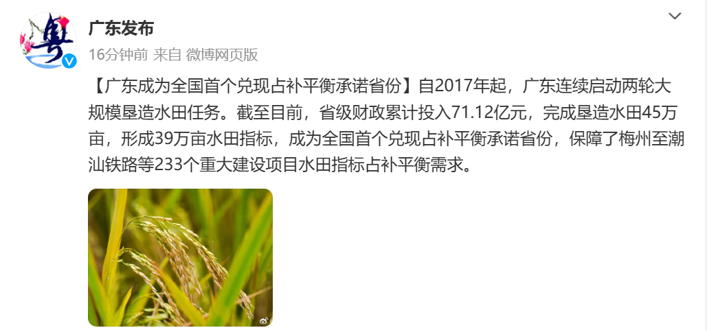 廣東成為全國首個兌現占補平衡承諾省份