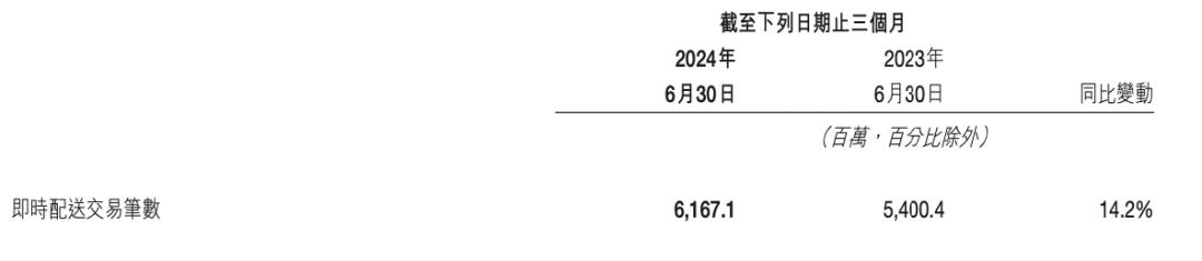 美團財報雖然沒有直接點出閃購業(yè)務為公司貢獻了多少收入,但Q2即時配送交易筆數(shù)同比增長14.2%,配送訂單數(shù)達到了近62億單,日均超6800萬單,一定程度上能說明這項業(yè)務的增長潛力。