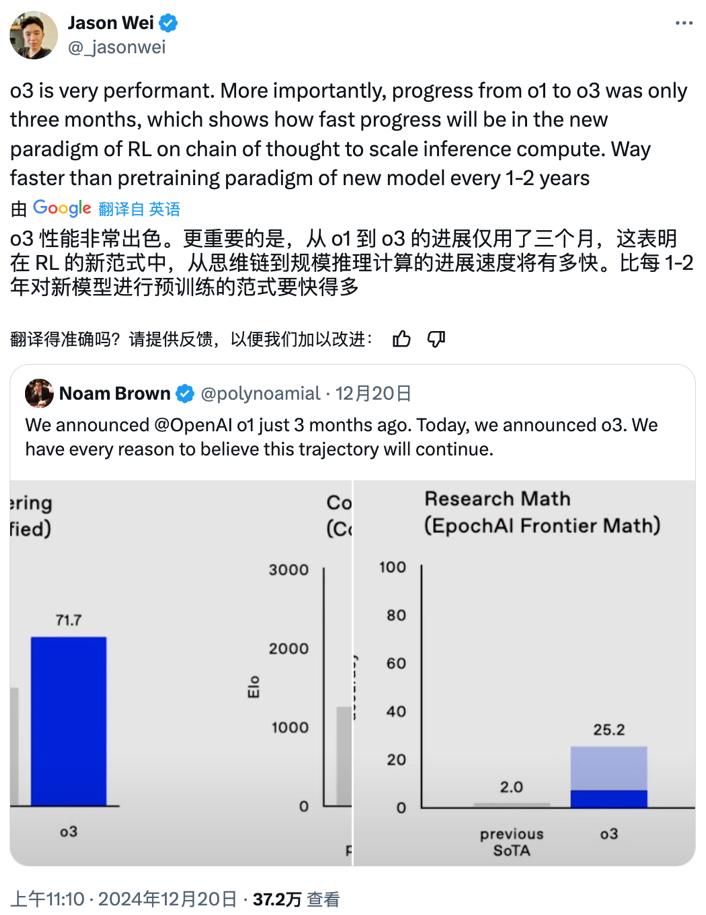 最后是OpenAI模型訓練速度的問題。在中文社區頗有影響力的Jason Wei表示:從o1到o3的升級僅用了三個月時間,證明了基于思維鏈的強化學習新范式,比傳統預訓練方式每1-2年才能推出一個新模型的節奏要快得多。