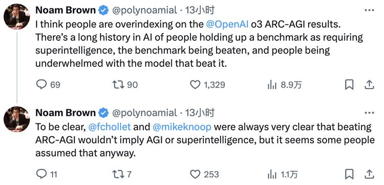 對此,OpenAI多模態推理研究員Noam Brown發文表示:外界對ARC-AGI測試的反應有些過度,突破ARC-AGI基準并不意味著模型已達到AGI水平。他還提到了AI領域的一個普遍現象:人們往往認為某個基準測試需要"超智能"才能完成,但當真的有模型攻克這個基準時,人們又會因為它沒有達到預期中的"超智能"水平而感到失望。