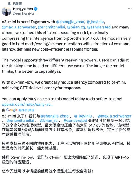 在這次發布直播中,年輕的華人研究員Hongyu Ren作為團隊代表,詳細介紹了輕量級模型o3 mini。