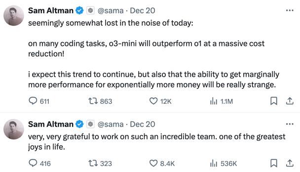 到強調o3-mini編程表現以顯著降低的成本超越o1,在線感激團隊成員的辛勞付出,稱大家一起工作是“人生中最大的快樂之一”;