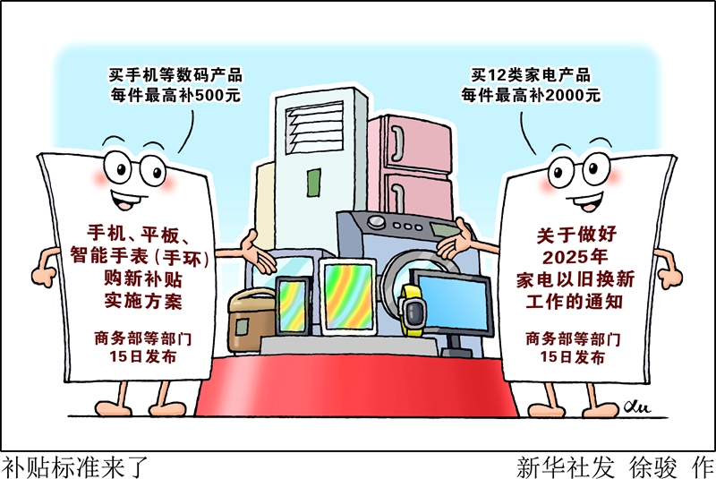 商務部等部門1月15日發布兩份文件,對實施手機、平板、智能手表(手環)購新補貼,以及做好2025年家電以舊換新工作予以安排,明確具體補貼品類和標準。其中,買手機等數碼產品每件最高補500元,買12類家電產品每件最高補2000元。
