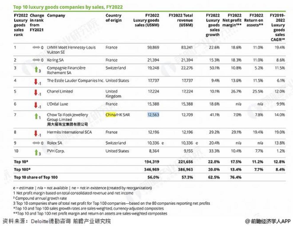 在德勤的榜單中,前十凈利率均值為17.5%,愛馬仕的凈利率高達29.1%,而周大福2023年的凈利潤率為7%,其奢侈屬性遠遠不足其他。