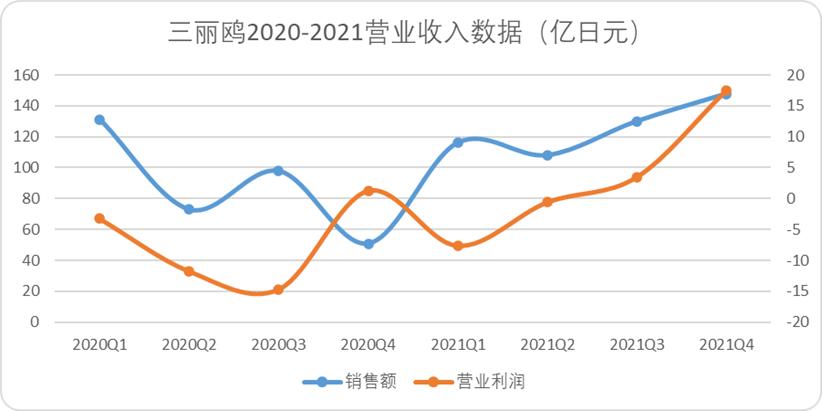 但三麗鷗“回血”的速度要遠(yuǎn)勝于同行,僅僅一年之后三麗鷗2021Q4營收錄得148億日元,營業(yè)利潤也快速扭虧錄得17.5億日元,填平了疫情周期的虧損。