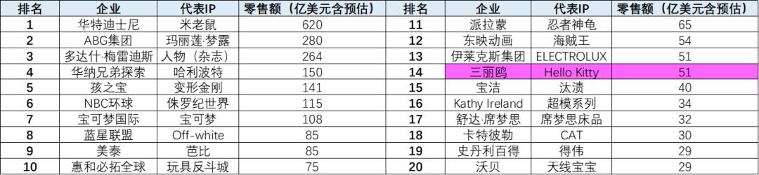 在全球最賺錢的單一IP統(tǒng)計(jì)中,Hello Kitty迄今收入總和已經(jīng)超過了860億美元,僅次于寶可夢(mèng),高于小熊維尼、米老鼠&唐老鴨和星球大戰(zhàn)。