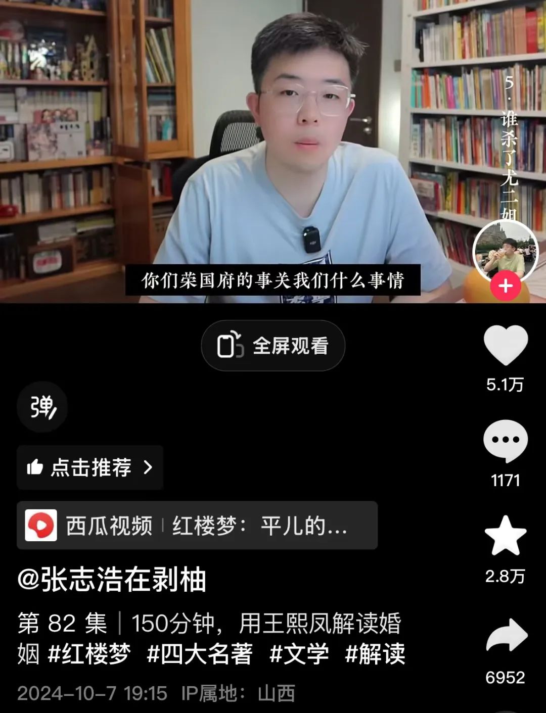 讓他沒想到的是,最愛看自己名著解讀視頻的會是一群二十多歲的年輕人,他制作的“紅樓人物品評”系列視頻圍繞書中人物性格展開,讓很多讀者再次燃起對《紅樓夢》閱讀熱情。