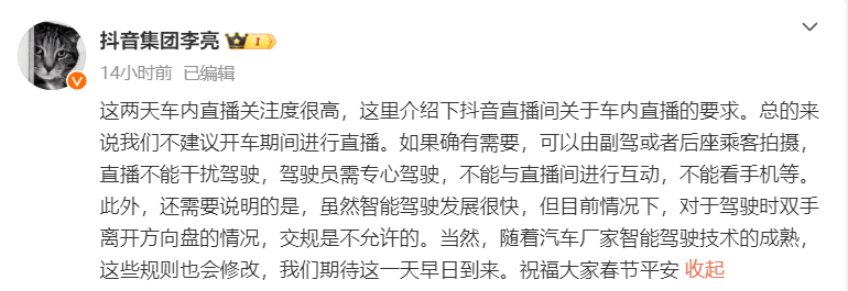 此外,李亮還說明:“雖然智能駕駛發(fā)展很快,但目前情況下,對(duì)于駕駛時(shí)雙手離開方向盤的情況,交規(guī)是不允許的。當(dāng)然,隨著汽車廠家智能駕駛技術(shù)的成熟,這些規(guī)則也會(huì)修改,我們期待這一天早日到來(lái)。祝福大家春節(jié)平安!”