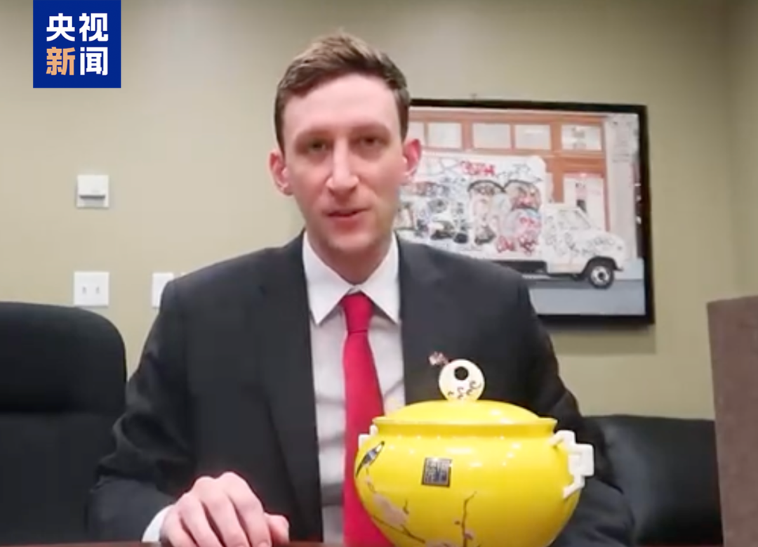 除夕晚上,身著一身唐裝的埃文為總臺蛇年春晚的節目報幕,還帶來了領事館回贈的象征珍貴友誼的中國瓷器。