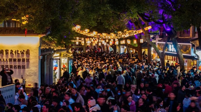 在總臺春晚中出鏡的拈花灣和窯湖小鎮(zhèn),今年春節(jié)的夜游項(xiàng)目豐富多彩,“夜游+民宿”的組合成為景區(qū)的新質(zhì)生產(chǎn)力,整個春節(jié)長假期間客房預(yù)訂率超過95%。