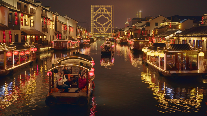 在總臺春晚的四個分會場中,無錫是唯一一個全水路串聯(lián)的城市。“舞臺”從燈火璀璨的古運(yùn)河,延伸至寬廣遼闊的太湖、滾滾東逝的長江,將“水韻無錫”表現(xiàn)得淋漓盡致。為了讓江南文化的特質(zhì)能被游客觸達(dá),“水”在今年的迎新春活動中扮演起重要的角色。