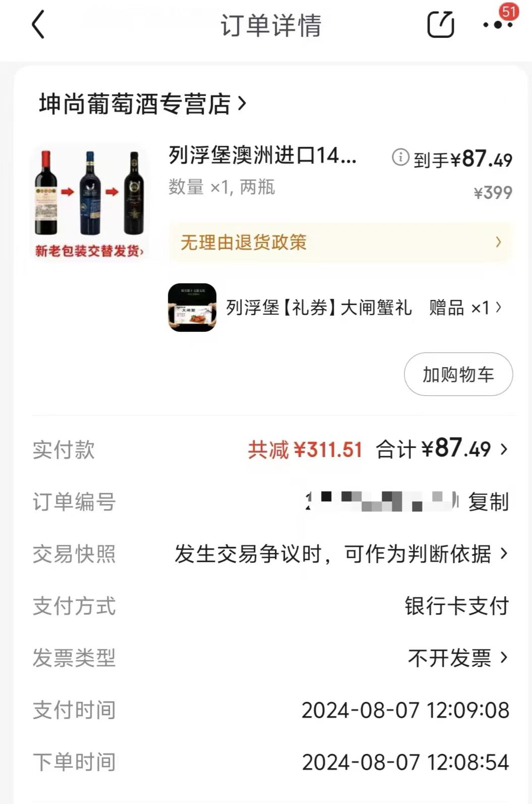 據張先生介紹,8月7號他在坤尚葡萄酒線上專營店看中一款紅酒產品,詳情頁顯示,87.49元可購買兩瓶進口紅酒并獲贈兩張大閘蟹禮券。“我一看送的大閘蟹是四公四母,挺合適的,就買了。”