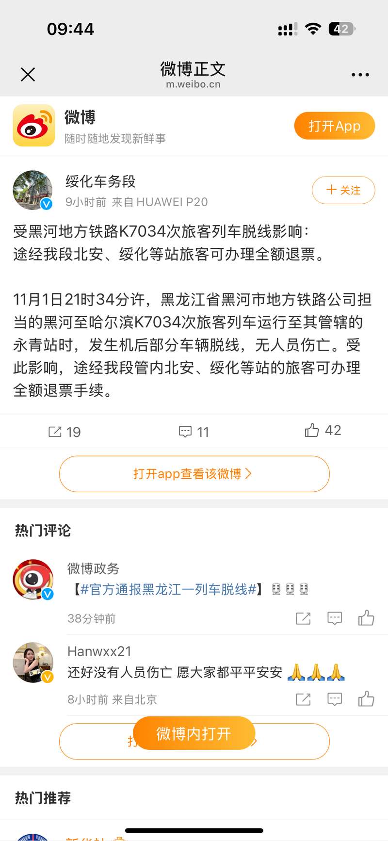 中國鐵路哈爾濱局集團有限公司綏化車務段官方微博發布的情況說明。微博截圖