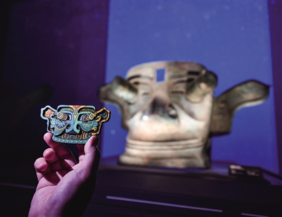 三星堆博物館里的青銅縱目面具冰箱貼。記者王曦攝