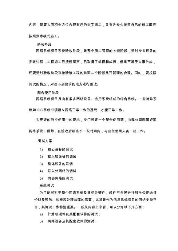 調(diào)試方案與系統(tǒng)測試是施工方案中的關(guān)鍵環(huán)節(jié)。從核心設(shè)備到接入層設(shè)備,再到整體設(shè)備的聯(lián)調(diào),每一步都經(jīng)過精心策劃與嚴(yán)格測試。特別是網(wǎng)絡(luò)子系統(tǒng)的測試,更是重中之重,確保網(wǎng)絡(luò)設(shè)備與軟件、計(jì)算機(jī)系統(tǒng)與網(wǎng)絡(luò)系統(tǒng)的完美集成。