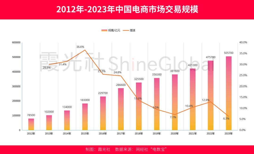 過去二十年,電商在中國取得的發展令全世界矚目。從2003年到2023年,中國電商市場規模由11.6億元增長到50.57萬億元,增長40多萬倍。而對中國電商帶來助推力的幾個發展節點是:2009年,民營快遞獲得國家政策開放與鼓勵;2013年,線上支付進入爆發期;2016年,直播電商崛起,開辟電商第二增長曲線。