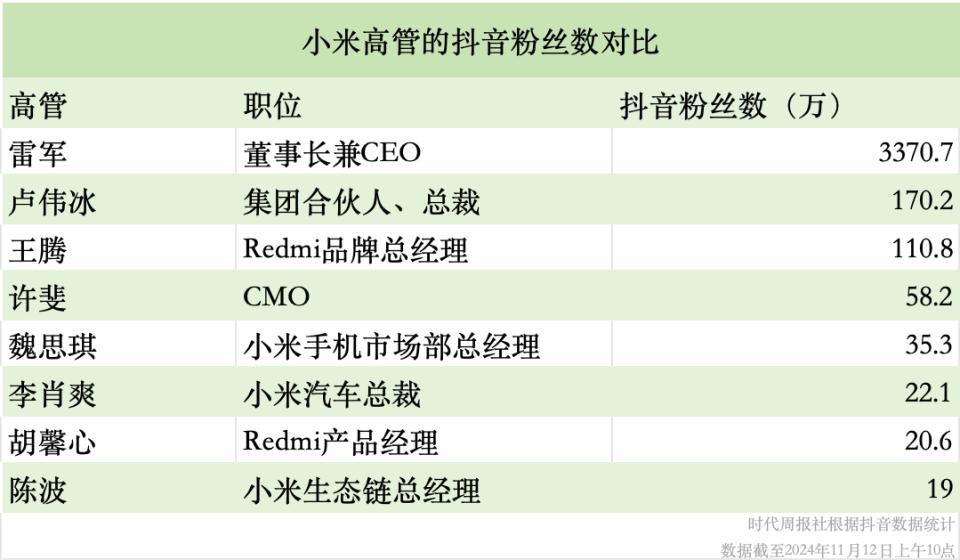 吃到甜頭之后,雷軍趁熱打鐵,帶領下屬“組團”加入網紅賽道。包括小米集團合伙人、總裁盧偉冰,小米集團副總裁兼集團CMO許斐,以及小米中國區市場部副總經理、Redmi品牌總經理王騰等多位小米高管均已經開設了自己的社交賬號,他們的人設定位各有不同,相互串臺,以此打造網紅賬號矩陣,更全方位的向市場展示小米。