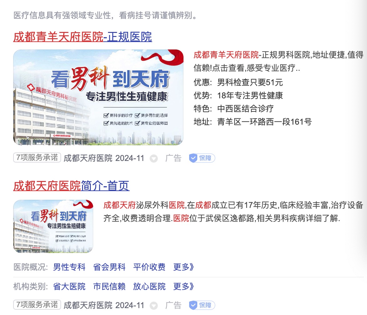 澎湃新聞查詢相關信息發現,針對該院的投訴不止上述一起。2024年9月26日,一位家長在四川“群眾呼聲”平臺投訴,孩子經青羊天府醫院診療為包莖,有輕微炎癥。經多次治療,花費兩萬多。家長咨詢了其他醫生后,認為割包皮,治療炎癥花兩萬多可能是“被宰”了。