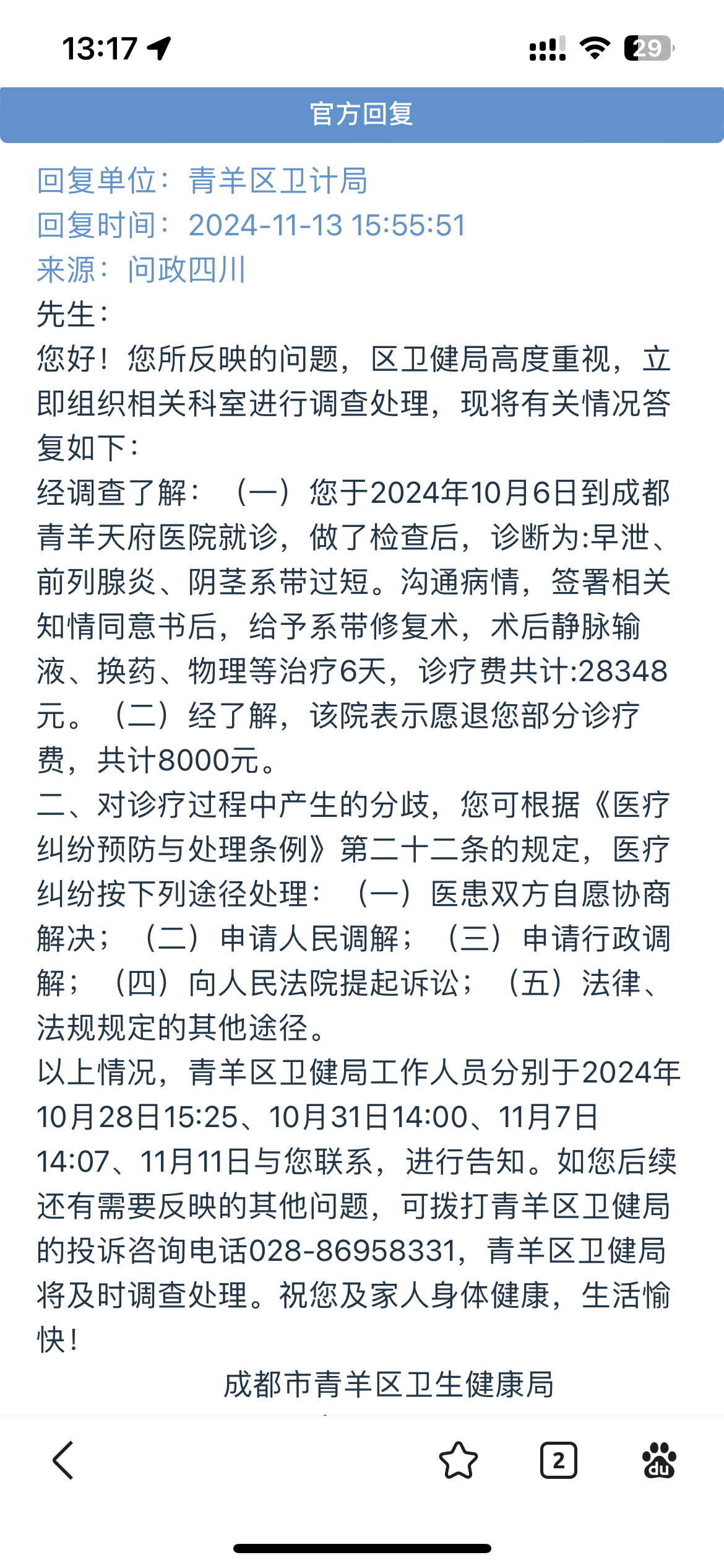 11月13日,成都市青羊區衛生健康局回應稱,經調查了解,投訴男子于2024年10月6日到成都青羊天府醫院就診,做了檢查后,診斷為:早泄、前列腺炎、陰莖系帶過短。在溝通病情,簽署相關知情同意書后,給予系帶修復術,術后靜脈輸液、換藥、物理等治療6天,診療費共計:28348元。經了解,該院表示愿退部分診療費,共計8000元。