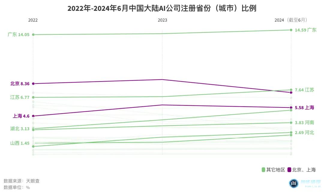據天眼查統計,2023年以來,北京、上海對AI初創公司的吸引力在下降,非一線城市的AI新公司數量反而在一路上升。
