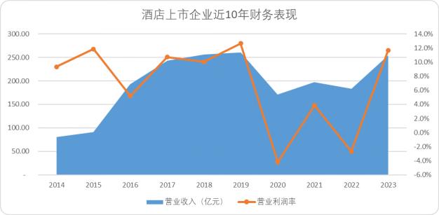 與之對應的是,以文旅部的數據來看,2014年-2019年(疫情前)全國星級飯店OCC和RevPAR兩項關鍵指標均邁上了新臺階;以上市酒旅企業披露的數據來看,2015年后營收規模和利潤率也出現了明顯的增長。