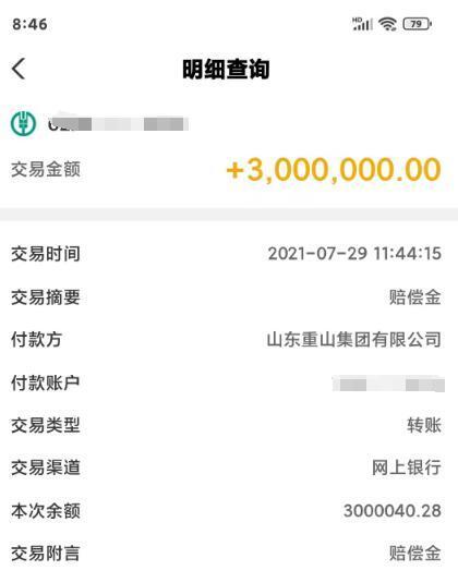 同日上午11時44分,山東重山集團有限公司向王長征轉賬300萬元,交易附言“賠償金”。