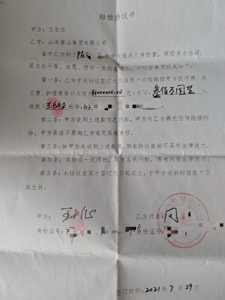 在淄博市淄川區信訪局、羅村鎮政府等單位負責人的協調下,7月29日,山東重山集團與王長征簽訂《賠償協議書》,給予后者人身損害賠償300萬元。