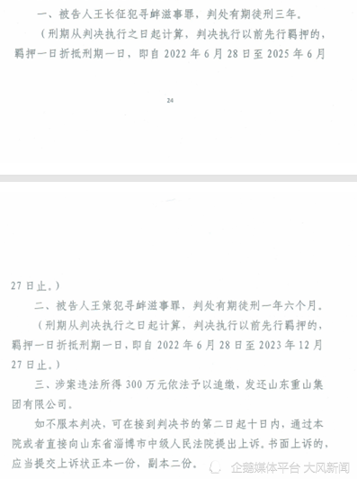 一審法院認為,從表面看系山東重山集團就王長征被打傷一事達成賠償協議,賠償300萬元人身損害賠償,實質是被告人王長征長期、頻繁投訴給山東重山集團生產經營造成不利影響下,以被該公司保安打傷為借口,借協商之機,利用簽署賠償協議的形式達到向山東重山集團斂取巨額財物的非法目的……王長征犯尋釁滋事罪,判處有期徒刑三年;王策犯尋釁滋事罪,判處有期徒刑一年六個月。涉案違法所得300萬元依法予以追繳,發還山東重山集團。