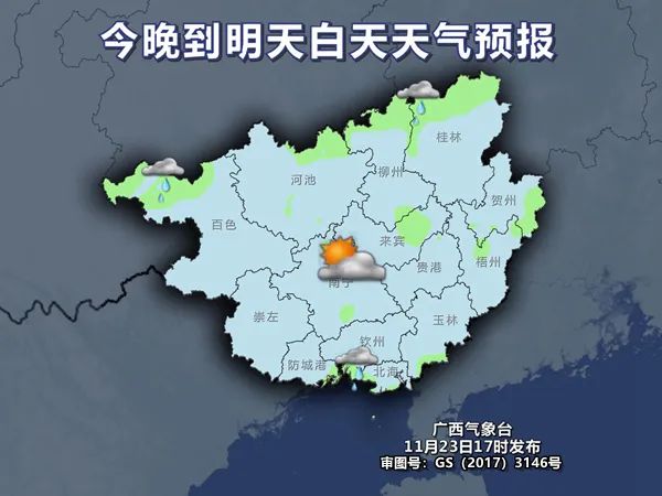 今天晚上到明天白天,百色、河池、柳州、桂林、防城港、欽州、北海等市多云間陰天有分散小雨,其它地區多云。