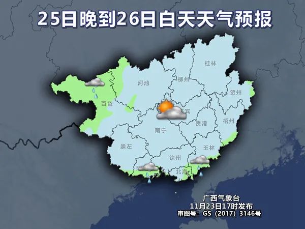 25日晚上到26日白天,桂西北和沿海部分地區陰天有分散小雨,其它地區多云。全區大部有5~6級、陣風7~8級的偏北風。