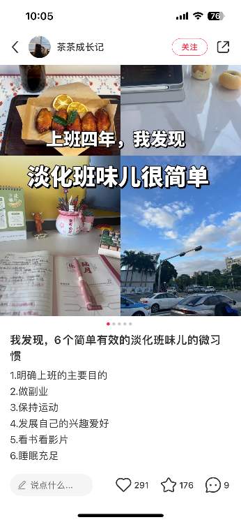 班味兒入侵的背后,其實是人在慢慢失去對自己身體的掌控權。因此,去班味兒自然被無數“要重奪掌控權”的年輕人提上了日程。打開社交平臺,會發現上面有不少年輕人在分享自己的“去班味兒大法”。