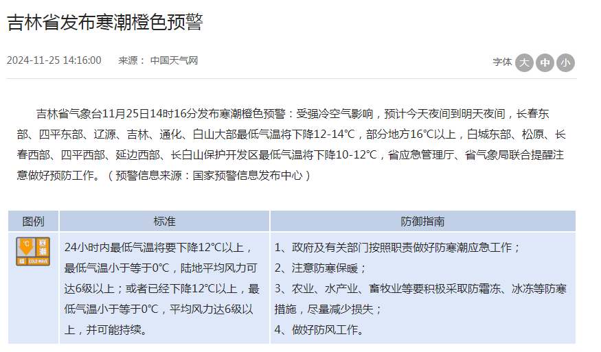 吉林省氣象臺11月25日14時16分發(fā)布寒潮橙色預警:受強冷空氣影響,預計今天夜間到明天夜間,長春東部、四平東部、遼源、吉林、通化、白山大部最低氣溫將下降12-14℃,部分地方16℃以上,白城東部、松原、長春西部、四平西部、延邊西部、長白山保護開發(fā)區(qū)最低氣溫將下降10-12℃,省應急管理廳、省氣象局聯(lián)合提醒注意做好預防工作。