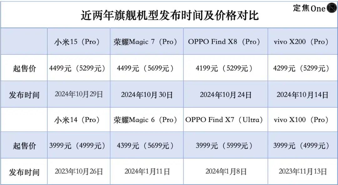 據「定焦One」梳理,廠商們首先是提前了發布時間。自從今年9月蘋果發布iPhone 16系列以來,小米、榮耀、OPPO、vivo等廠商都已發布了最新的旗艦機型,發布時間均較上一代機型有所提前。