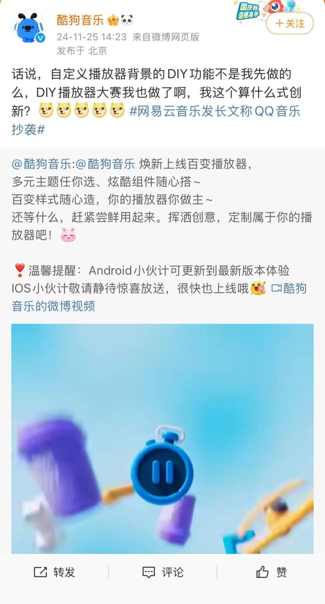 酷狗音樂在其官方微博上表示,自定義播放器背景的DIY功能,并不是網(wǎng)易云音樂首創(chuàng),而是酷狗音樂早在幾年前就已經(jīng)推出的功能。酷狗音樂還提到,他們曾經(jīng)舉辦過DIY播放器大賽。