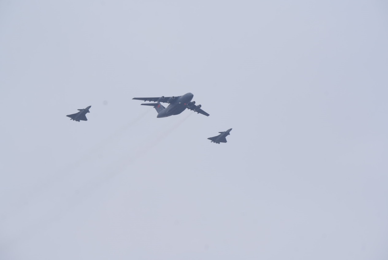 2023年,第十批在韓中國人民志愿軍烈士遺骸回國,“運-20”和兩架護航飛機“殲-20”。人民網(wǎng)記者 邱宇哲攝