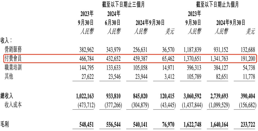 到2023年Q1財報,知乎將收入口徑重新進行劃分,分成營銷服務、付費會員、職業培訓和其他(電商)。也正是這一季度開始,付費會員貢獻開始反超廣告,成為知乎的支柱性收入。到本季度,營銷服務收入占比下滑至30.41%,付費會員收入占比首次過半,達到54.32%。