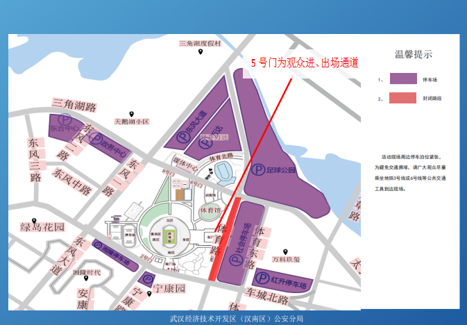 3、自駕前往武漢體育中心觀看賽事活動的車輛,請服從工作人員的指引,將車輛規(guī)范、有序停放在停車場。