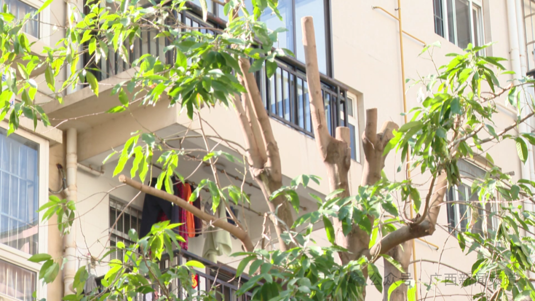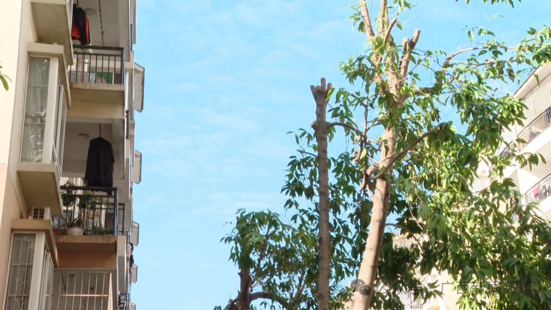 在位于南寧市青秀區的鳳嶺名園小區,主干道兩旁的樹木被鋸掉了大部分枝條和葉子,只剩下幾根又短又禿的一級分枝。